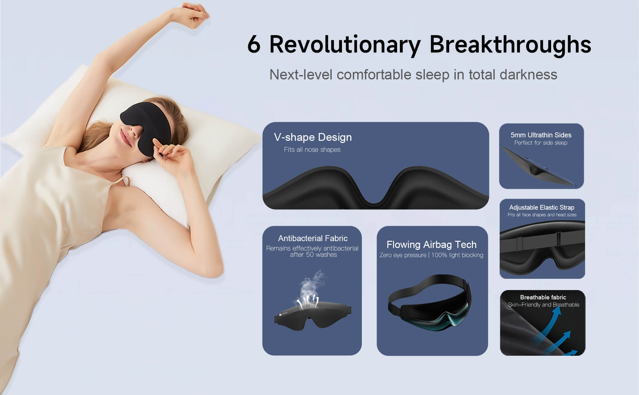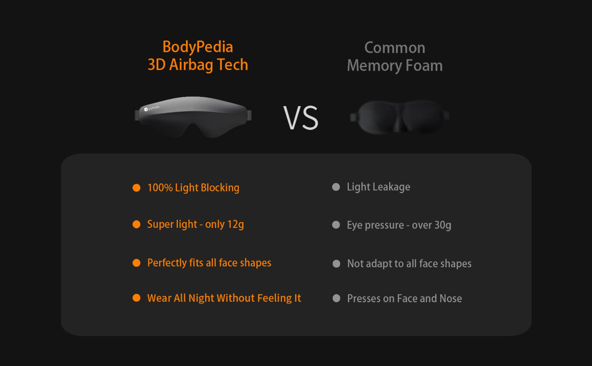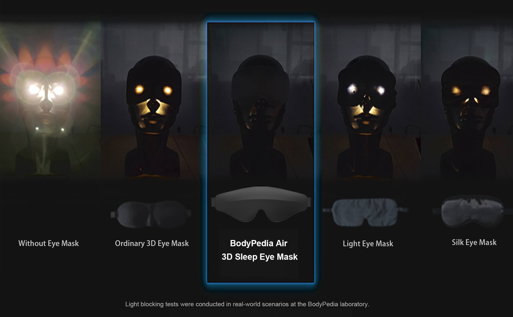 Experience the ultimate in comfort and light-blocking with the BodyPedia Air 3D Sleep Eye Mask. Weighing only 12g, this revolutionary mask features our patented airbag technology, making it super lightweight and incredibly comfortable. Its innovative 3D design, combined with soft, breathable fabric, ensures zero eye pressure and a perfect fit for all nose shapes—guaranteeing 100% light blockage for a restful night's sleep.